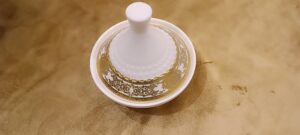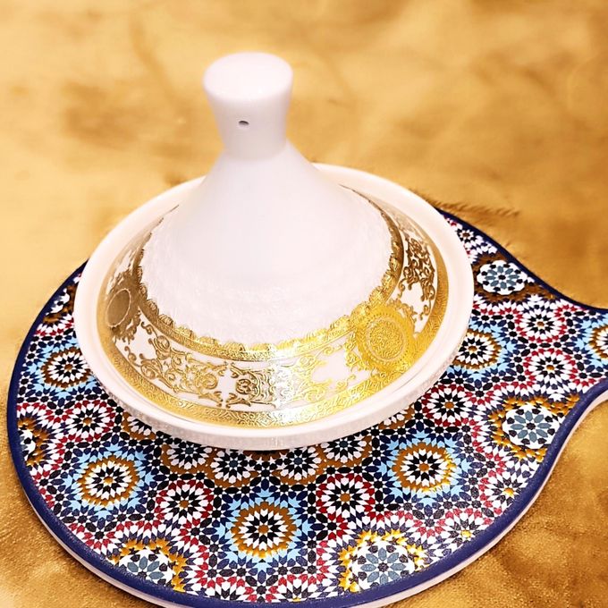 Petit tajine en céramique blanche ornée de détails dorés. Conçu exclusivement pour la présentation, ce tajine n’est pas destiné à la cuisson, mais sublimera vos fruits secs, salades, sauces et autres garnitures. Parfait pour enrichir visuellement vos repas et créer une ambiance conviviale et raffinée. Caractéristiques : • Matériau : Céramique blanche émaillée de haute qualité • • Dimensions : Compact et pratique, idéal pour présenter de petites portions (exemple : hauteur 14 cm, diamètre 14 cm) • Usage : Plat de service uniquement, non compatible avec la cuisson mais conserve la chaleur • Fabrication : ceramique raffinée Avantages : • Sublime la présentation de vos mets sur la table • Idéal pour fruits secs, sauces, salades, tapas et autres accompagnements • Ajoute une note décorative élégante et chaleureuse à vos repas • Facile à nettoyer grâce à son émail lisse • Parfait pour toutes les occasions, du quotidien aux repas festifs Conseils d’utilisation : Utilisez ce tajine comme un plat de service pour mettre en valeur vos préparations froides ou chaudes. Ouvrir son couvercle est un geste élégant qui transforme le service en une expérience conviviale et raffinée. Ce type de tajine décoratif est une belle alternative aux plats traditionnels pour ceux qui souhaitent allier esthétique et convivialité sans cuisson directe